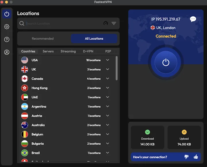 On longer-distance routes, performance was more variable. Some international locations showed noticeable drops in speed, reflecting FastestVPN’s smaller server footprint and the impact of distance on routing. These results weren’t surprising and are typical of VPNs with a more limited global spread.