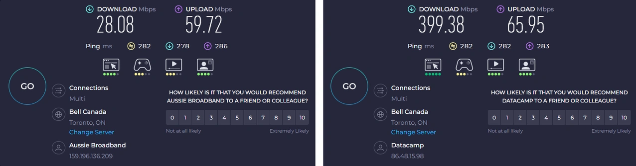 The Baseline (VPN OFF): Measures the true speed of my ISP’s “public road.”