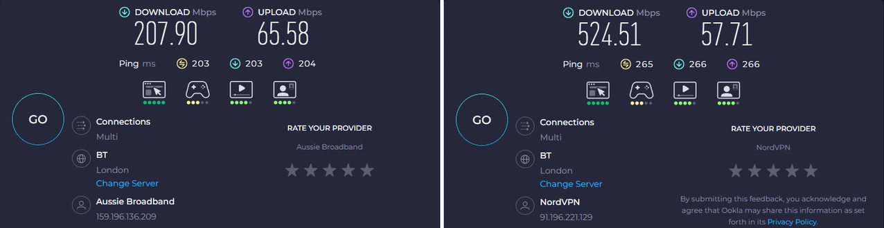 It’s a repeatable, data-driven pattern: NordVPN often picks a cleaner route than my ISP, especially during busy hours. When the public highway is congested, Nord’s “private road” can be significantly faster.