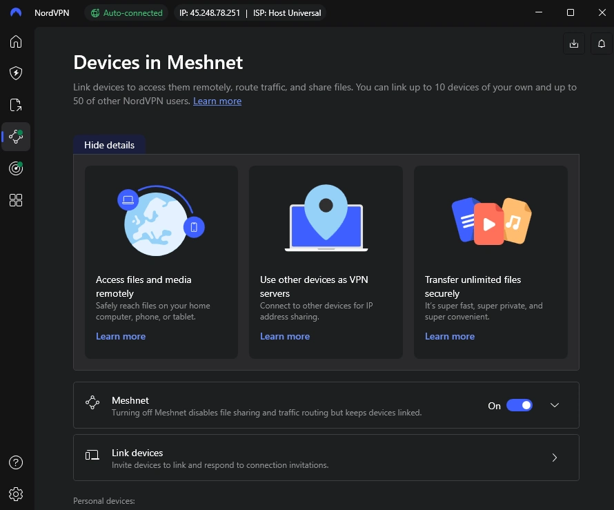 Meshnet is a newer feature that lets your own devices connect to each other through NordVPN - useful for sharing files or accessing your home computer while you're away.