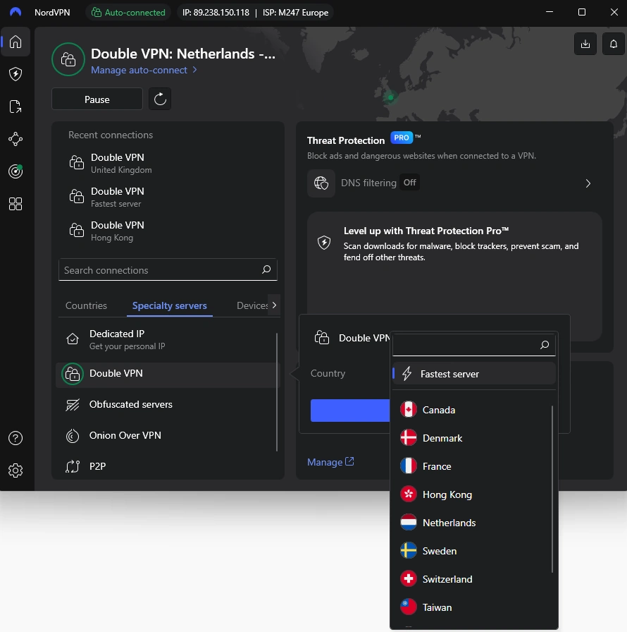 If you want even more privacy, Double VPN routes your traffic through two secure servers instead of one, and Onion over VPN adds extra layers of anonymity.